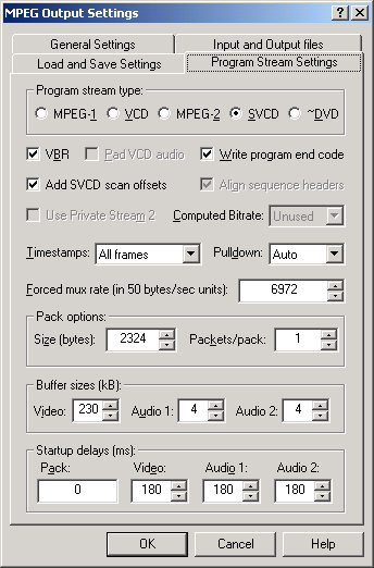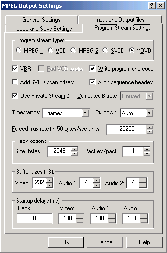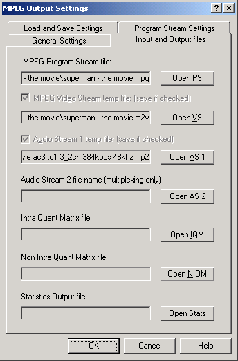 | Step 2(a/b/c/d) - Under the "General Settings" select the "MMX modes" compatible with your CPU, then go to "Input and Output files" and in the "MPEG Program Stream file" select the Output of your muxed files. In the "Open VS" select the MPEG2 Video ONLY file, In the "Open AS 1" select your First Audio Track, and if you are creating Multi-Channel movie use "Open AS 2" to select secondary audio. Under the "Program Stream Settings" set either MPEG2/SVCD or DVD Stream type. Click "OK" when done. a) b) ![]() c) d) ![]() |