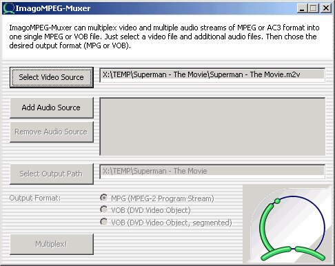 click on "Remove Audio Source" and finaly, click on the "Select Output Path" to where you want the new file to be created, then select the "Output Format" which can be an MPEG2 file or even a VOB file format and click on "Multiplex" to begin processing.