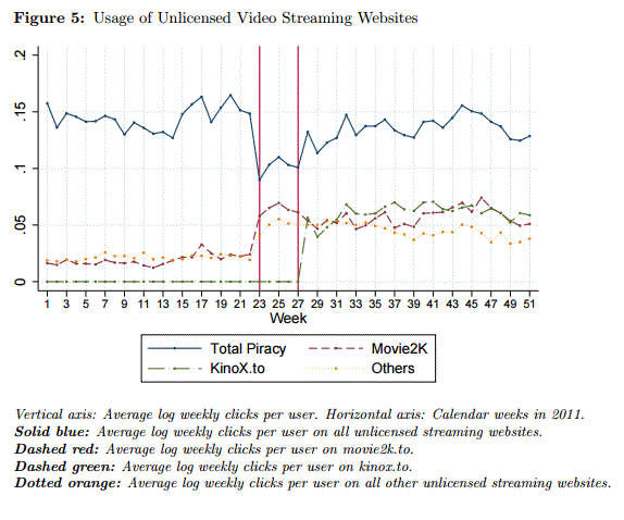 While piracy rates declined by a third immediately following the shut down of Kino.to, the level of piracy was practically back to previous levels only a few weeks later. The shutdown also helped other piracy sites, including rival Movie2K, which absorbed traffic that used to go to Kino.to. And within a couple of weeks, a replacement site, Kinox.to, sprung up and quickly established itself as another viable alternative.