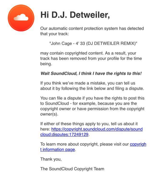 In an attempt to protest and troll SoundCloud's automated copyright take-down system, DJ Detweiler uploaded a "remix" of John Cage's 4'33. A completely silent, blank remix (which technically is still a remix), and one that should not fall foul of SoundCloud's system. But it did.