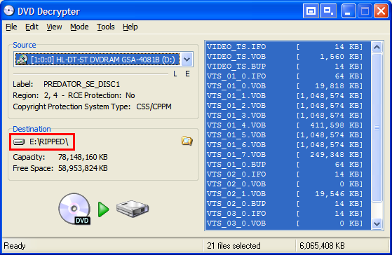 Rip DVD to hard drive (RIPPED) with DVD Decrypter using File mode (selecting all files).