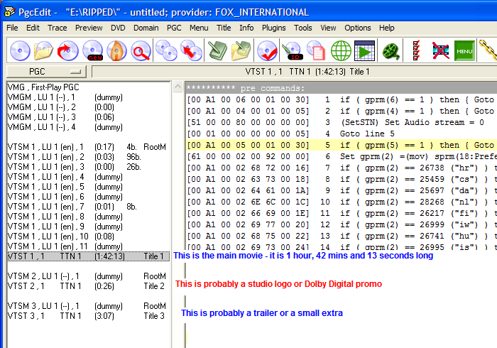 Open PgcEdit and click on File >> Open DVD (or Ctrl-O). Navigate to RIPPED and click on OK. Now, find your main movie; it won't be hard because it will be the Title that is longest in length. You can tell it's in VTS_01 from the DVD Decrypter diagram above. But the easiest way is to look in the PgcEdit screen.
