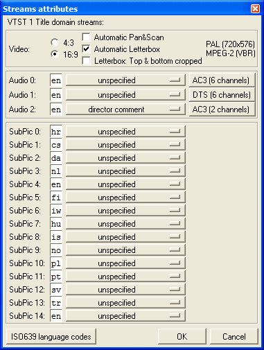 Take a note of where the various streams are and what each stream represents. In particular, cross check this against your re-authored DVD. For example, say you re-authored and kept the English AC3 6 channel stream and both English subtitle streams. You would note that your audio stream belongs as Audio 0 and your subtitles belong as Subpic 4 and Subpic 14 respectively.