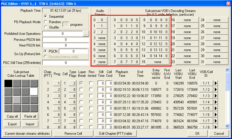 You can see that English AC3 6 channel is represented by a 0 in position 0. The subpics for English are represented by 0 4 4 0 and 0 14 14 0 respectively in slots 4 and 14. These are the actual stream IDs in the VOBs.