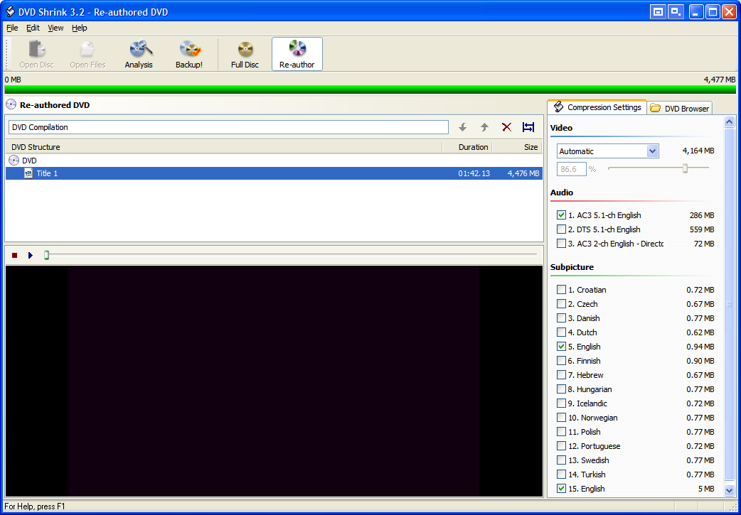 (Notice that the stream numbers have shifted by 1 - English subtitles are 5 and 15 - this is because like all things computer, they really start at 0 but DVD Shrink is more "user friendly").