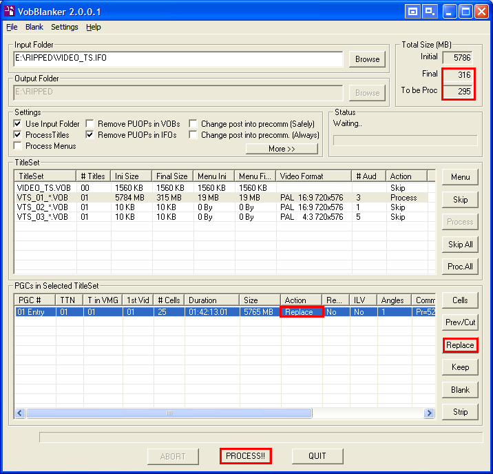 You will notice that VobBlanker now has the action Replace and shows you new information at top right about the size (in this example, I have re-authored out many chapters, so the size is much smaller).