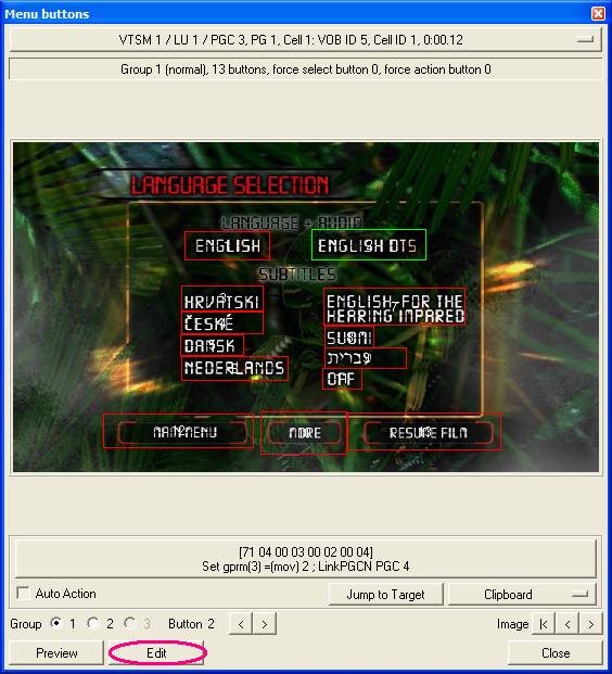 (d) Do this for all the languages that you have stripped in the re-authoring of your DVD (you can stay in the Menu Editor and just increment the button number in the "Edit button" box).