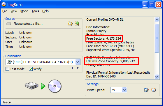 (viii)         Find out the sizes of the media you have and enter them in the appropriate boxes. Do this by popping a blank DVD into your drive, opening ImgBurn, pressing W and noting the number of free sectors and, for dual layer disks, both the number of free sectors and (if you use –R dual layer disks) the L0 Data Zone Capacity.
