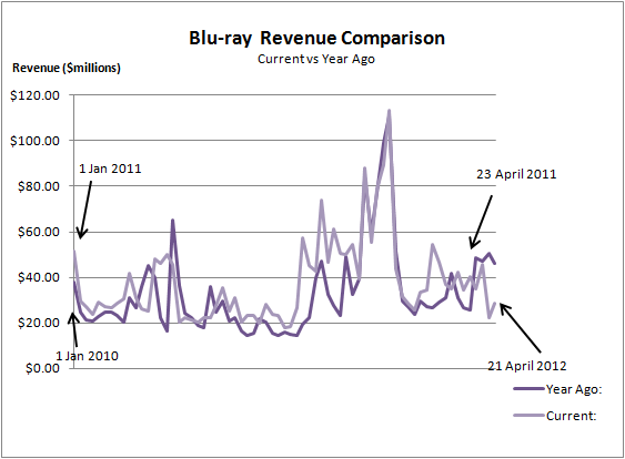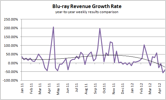 With less data being available than the equivalent graph for Blu-ray market share, the trend here is harder to see, and more volatile. But revenue is always a bit more volatile, as you can see the violent spikes indicate the a major release milestone for the format. The effect of the recent drought of A-list releases can be seen quite clearly towards the end of the above graph, as revenue growth drops below 0% (ie. a revenue decline). As a comparison, revenue growth for the first 16 weeks of 2011 averaged 33.24%, while for the same period in 2012, it only averaged 14.45%.
