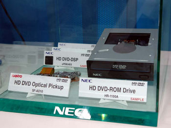 NEC HR-1100A will be available in the market beginning in October. The drive will be shipped with playback software and couple of movies. It is able to play back HD DVDs, DVDs and CD discs, drives with writing capabilities are expected for January 2006 when also the first Bluray drives should hit the market. For playback a display adapter with HDCP or HDMI interface is needed, the VGA output will not work.