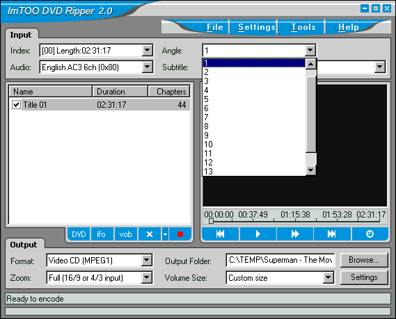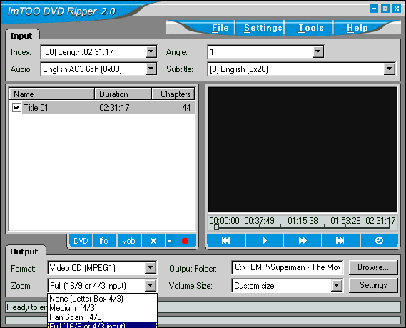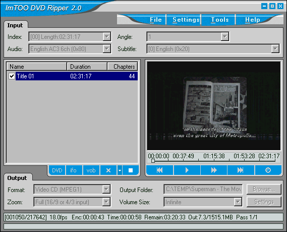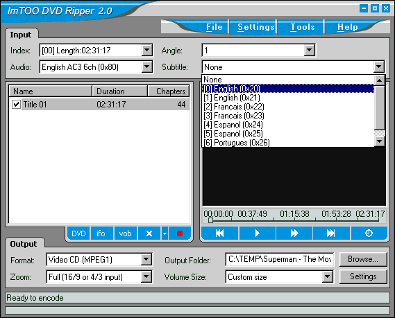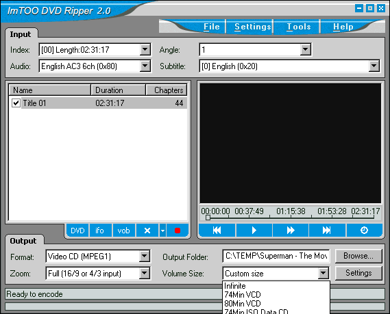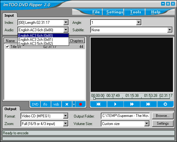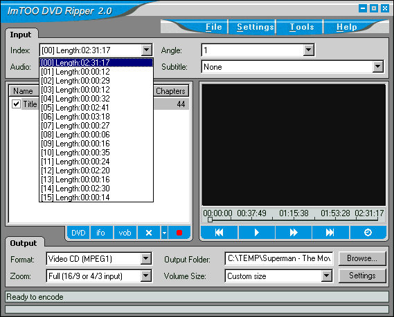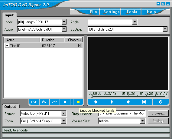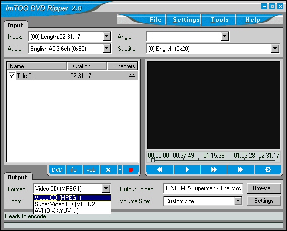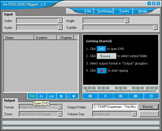 used in this guide: Backup/Encoding - ImTOO DVD Ripper Chapters - Chapter-X-Tractor Authoring - VCDEasy ( & ASPI Layer for your system! - use the search for "WinASPI" or scrool to the bottom of the page!) |