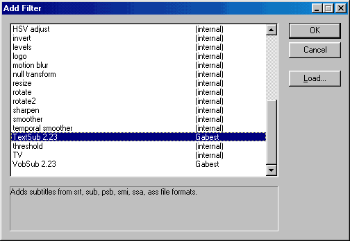 Step 1f) - In the "Add Filter" selection, if your VobSub is not there, click on the "Load..." button. ![]() |