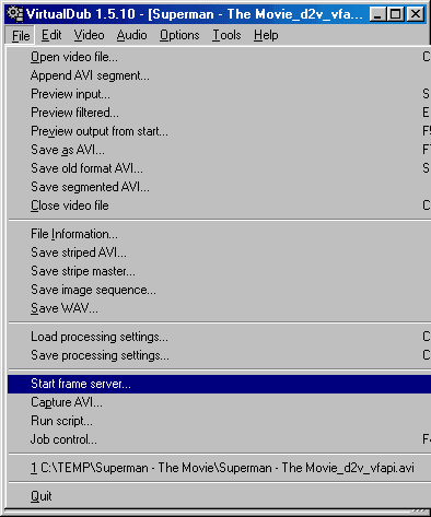 Step 2(a/b) - Click on the "File" menu and then click on "Start frame server..." and when you get the "Frameserver setup" click on "Start"