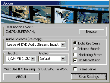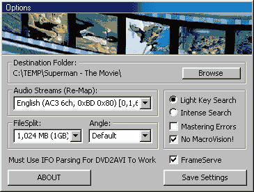 | This program is capable of accessing the DVD Movie's IFO file and extracting the Chapters Information so it will be used in to create a VCD/SVCD with the same Chapter Points, so when you use the Remote Control you can jump from chapter to chapter. |