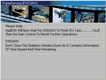 Step 5 - If you have selected to use the build-in " FrameServe" option, then when copying is done, it will automaticly invoke the internal DVD2AVI generator, which will open the "Statistics Window ", don't close it, when it's done, you are finished both copying and frameserving your movie. ![]() |