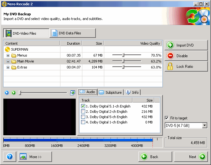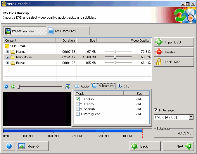 movie (this will increase the overall quality!) such as extra "Audio" and "Subpicture" languages (Subtitles). When you are satisfied with your choices, click on "Next" to continue.![]() ![]() |
