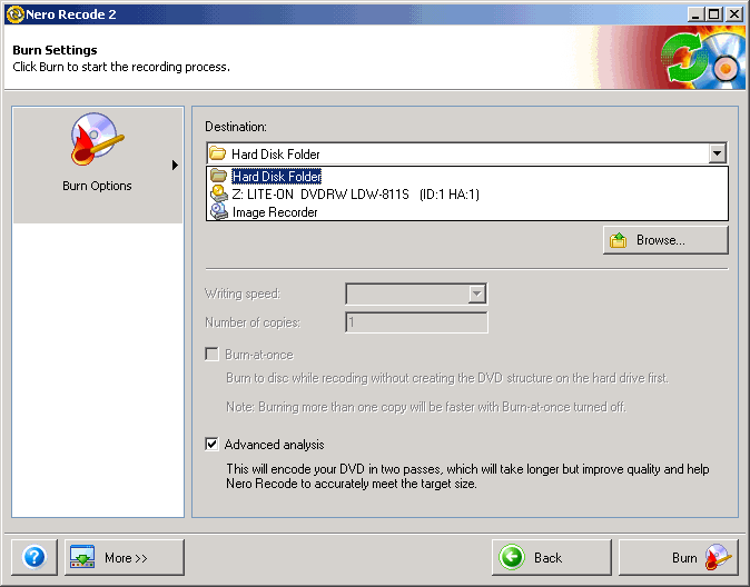 Step 3(a/b) - In the "Burn Options" select the "Destination" of your movie, either creating a "Hard Disk Folder" or Burning or using the "Image Recorder" to create an NRG image to burn later. I Recommand Enabling the "Advanced analysis" to increase encoding quality.![]() ![]() |