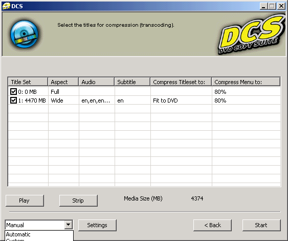Step 3 (a/b) - Now you can select the "Audio" and "Subtitle" on how to compress the Titleset on your DVD. By Default the "Automatic" is on (a), select the "Manual" to be able to change options. Then click on the "Title Set" you want to change, when done click on "OK" and then press "Start" to begin.![]() ![]() |