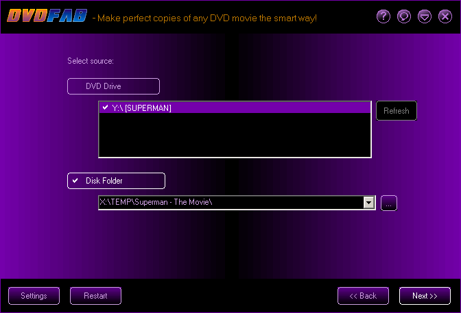 Step 2 - Use the "Select source" for your DVD movie this can be a "DVD Drive" or a "Disk Folder" and then click on "Next" to conintue.![]() |