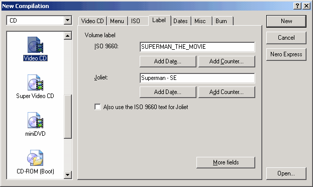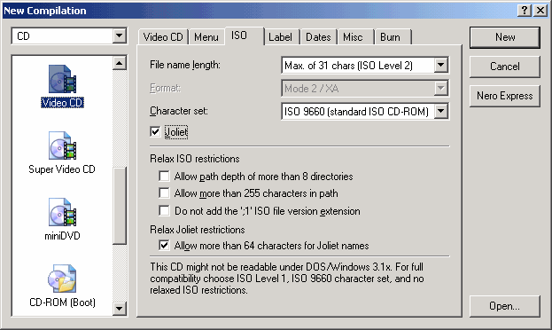 Step 1 - Select New Compilation and from the menu on the left, make sure you select Video-CD (or Super Video CD, depending on what you encoded!) and you will see 7 menu choices (1a), in the ISO menu, choose according to the image (Joilet is optional!) but ISO9660 should stay as DVD is not a PC and some will give problems if you use the Relax options (1b), now select the Label of your movie (1c) and Click on "New" 1a