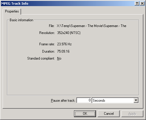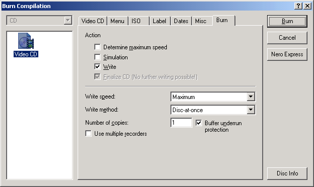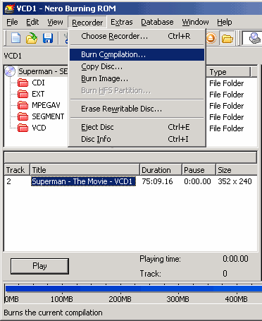 Step 2 - Drag your MPG file into the Tracks section in Nero and wait, as Nero will perform a check on your file and see if it is Compliant if you know you are doing a non-standard video, then when asked, Turn Off the Compliance Check! (2a), Double Click on the Track, and set the Pause to 0, so there will be no delay if you are doing multiple tracks (2b), now go into "Recorder" / "Burn Compilation" (2c), and mark the Write and select "Disc-at-Once" and "Finalize CD" and then you press the Write button (2d). 2a) 2b) 2c) ![]() |