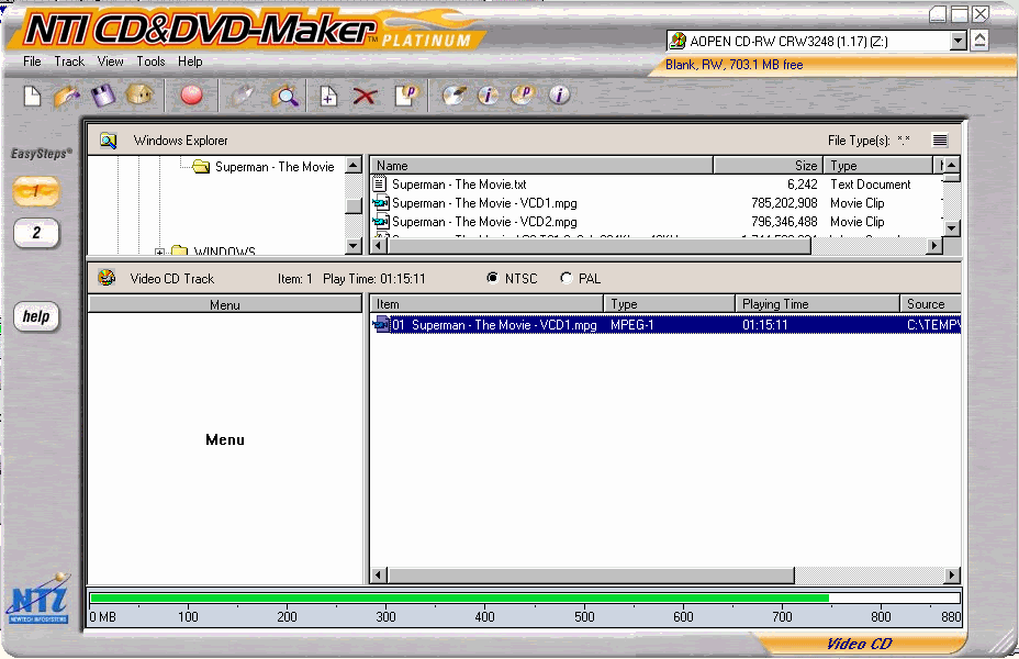 | NTI CD Maker 6 has basic functions for burning a VideoCD/SuperVCD, I wouldn't put too much effort on it, as it doesn't support anything except the actual burning of a MPG file into S/VCD disc, with the added bonus of creating a basic menu, as it does not support chapters. |