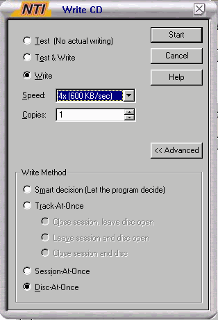 Step 4 - When you press on "Step 2" (in the program not in this guide! ) it will bring you a menu where you select to Test / Test & Write / Write and the method you will be burning, I suggest you manually select "Disc-At-Once", in case the program's "Smart decision " will decide to do something else!. ![]() |