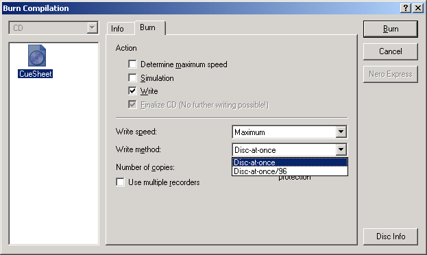 earlier, choose "Disc-At-Once" from the "Write Method" to