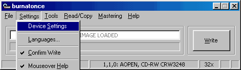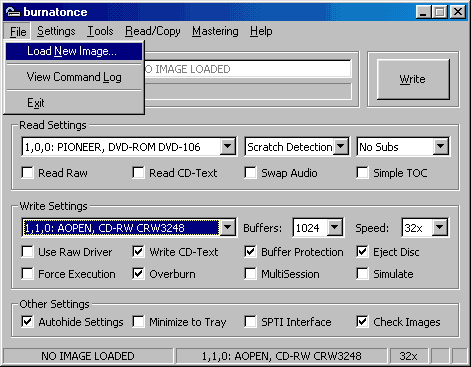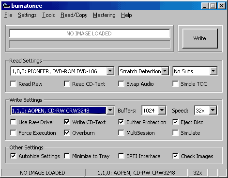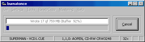 | This is a new Freeware program that supports the Bin/Cue file format, it also supports Overburning, Buffer Protection and more. NOTE: Since it uses the ASPI Layer, it is recommanded that you have v4.60 Build 1021 installed for this program to work properly. |