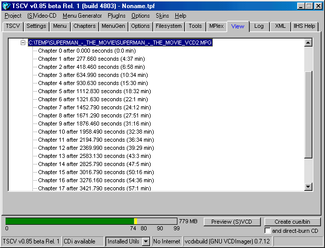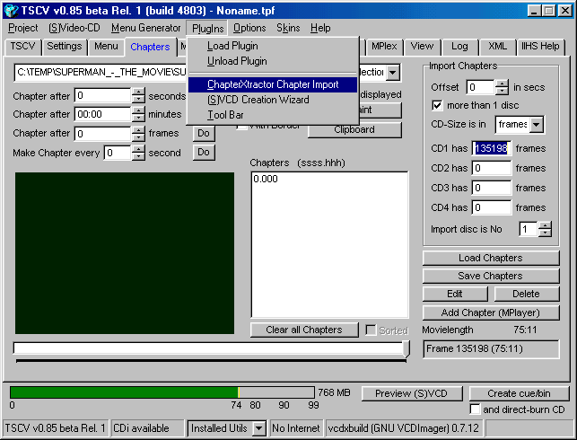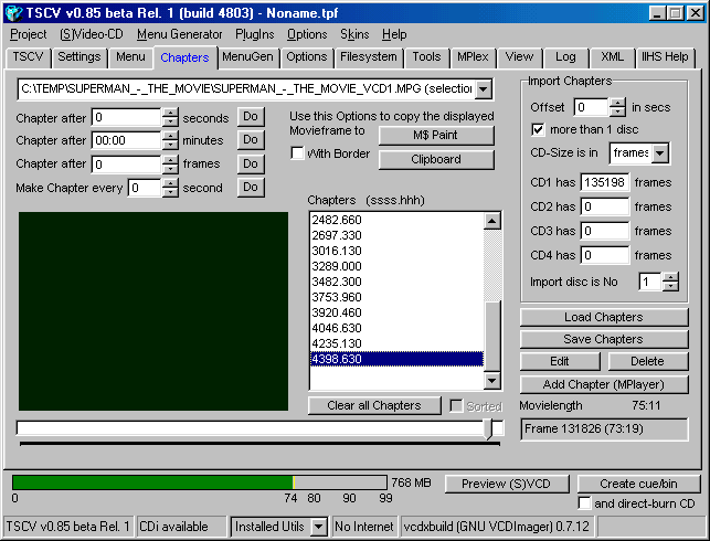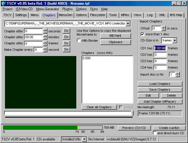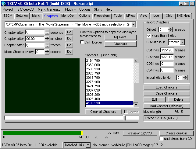 Step 3a - This will bring you to the "Chapters" section which looks like this, please dont use the menu items to switch from the previous screen as the Import Chapters buttons will not work, you must double click on the MPG to make it work, before importing, make sure if your movie is two parts (like in this example) that you tell TSCV there is " more then 1 disc" and type in the amount of frames each CD is going to have, you can use the movie slide bar at the bottom to find out how much frames are in the part you are doing.