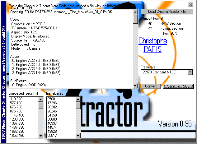 Step 3c - You should have a file you created earlier. This file will only exist if you followed the Chapter-X-Tractor settings example . Once you have that file, use the "Load ChapterXtractor File", and then select the "Framerate" of the movie (make sure it matches your movie!), then Press the "Convert" button, and when it's done, press the "Send To TSCV" button.