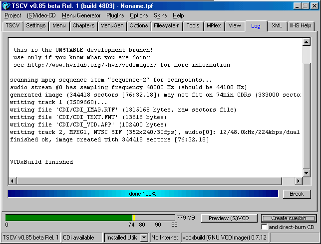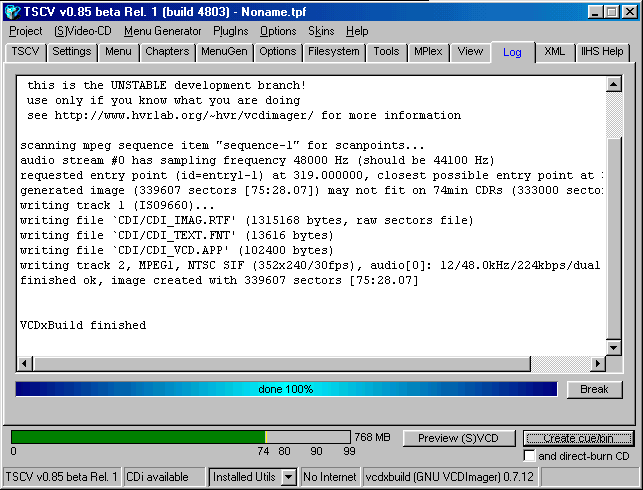 Step 6 - Go to the "Log" and press on the "Create cue/bin" and this will create the files which will be burned later on.