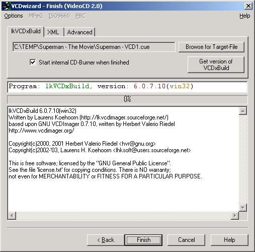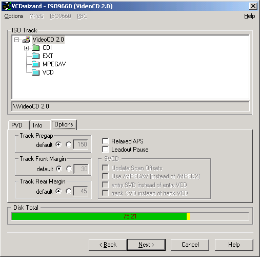 | This program is similiar to VCDEasy and the old TSCV program, it uses a built-in variation of VCDimager and CDRDao to create a 100% Standard VCD Image which you can burn with any program which supports Cue/Bin files. You get all the basic functions including Chapters. |