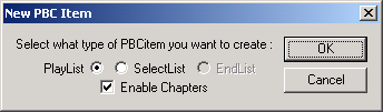 Step 4b - When you drag the chapters into the "PBC" you will get a popup window as below, select "PlayList" and click on "OK" ![]() |