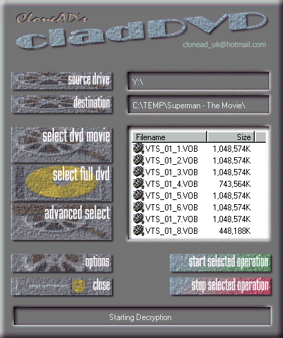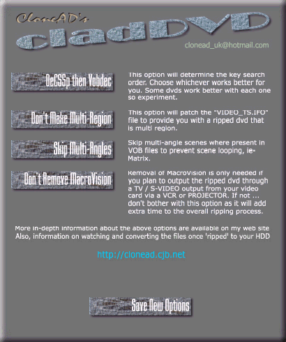 | This is an old ripper and no longer being updated, it has a replacement called CladDVD.net for XP only system, but this one is rather easy to use, although I wouldn't mind it would let me know how much time is left while ripping. |