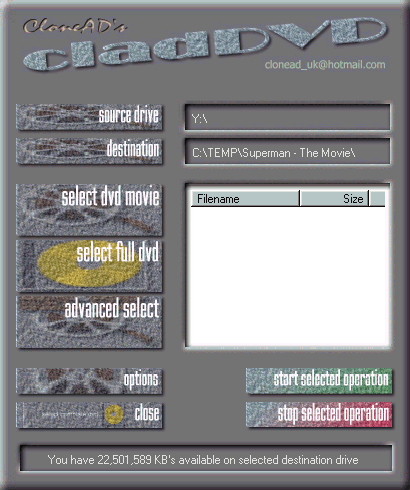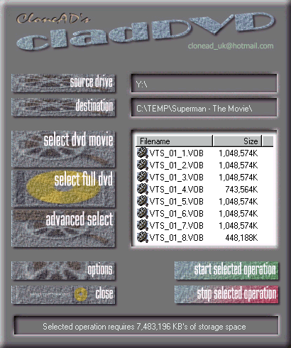 Step 2 - Press the "Select DVD Movie" button, and all the VOB files which will be copied will appear under the "Filename", you can also see the sizes there. if you are going to do a DVD to DVDR, then you better use "Select Full DVD" option instead.