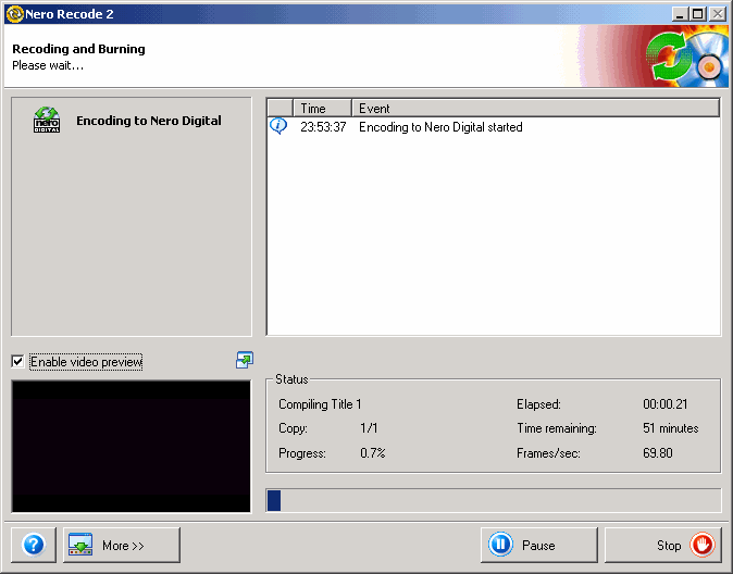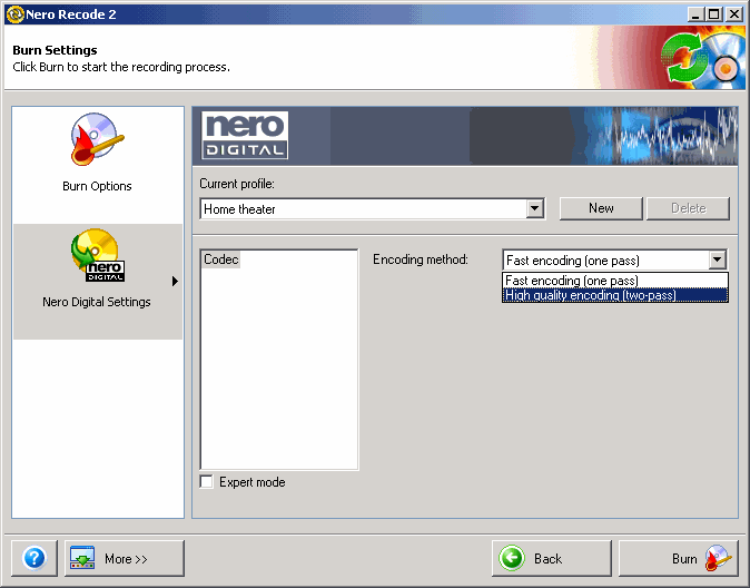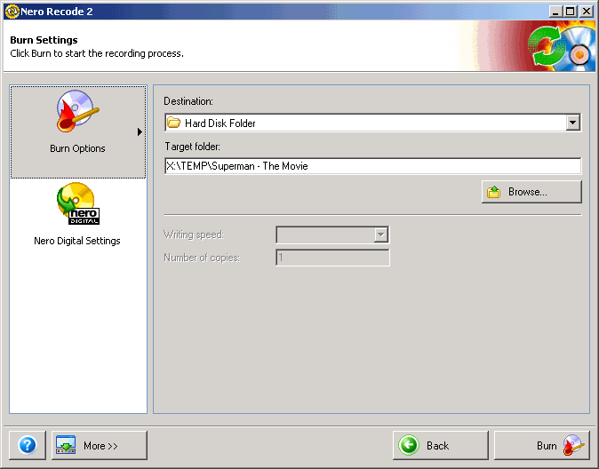 Now select the "Burn Options" for your movie, the "Destination" can be a "Hard Disk Folder" / "DVD Burner" or creating an NRG image using the "Image Recorder". Click on "Nero Digital Settings" to select the "Encoding method" and quality. You can enhance and tweak the quality by selecting the "Expert" mode. When you are done, click on "Burn" to being encoding.