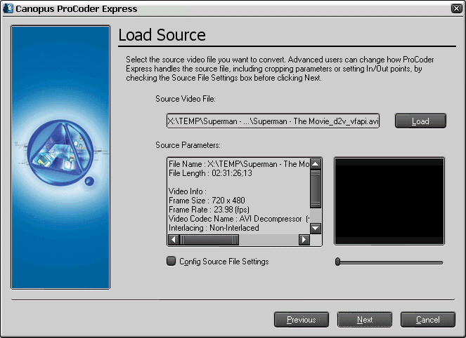 Step 1(a/b) - When you open ProCoder you will be asked what to do, select "Convert a source file to a different format?" and click the "Next" button. Then use the "Load" button under "Source Video File" to open the movie which you want to encode. You can see all the details of your movie in the "Source Parameters" box below. Click on "Next" to continue.![]() ![]() |