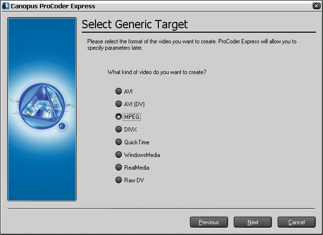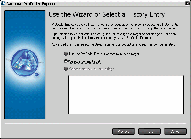 Step 2(a/b/c) - At the "Wizard" settings, you can let ProCoder select a target, or you can click on "Select a generic target" and set things yourself instead. Click on "Next"
