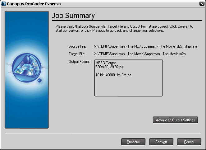 Step 4(a/b) - Now the "Job Summary" will reflect the "Output Format" settings you changed, if you are not satisified you can click again on the "Advanced Output Settings" and make changes. If you are ready, then click on "Convert" to begin the encoding process.![]() ![]() |