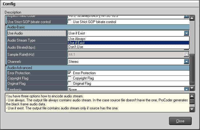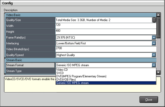 Step 3(a/b/c/d/e) - In the "Job Summary" you can see the predefined "Output Format" that was selected by ProCoder, if you want to make changes, click on "Advanced Output Settings" to set up your "Output Format" type. In the "Config" menu (a), first select the "Stream Format"