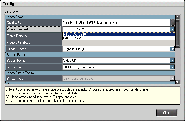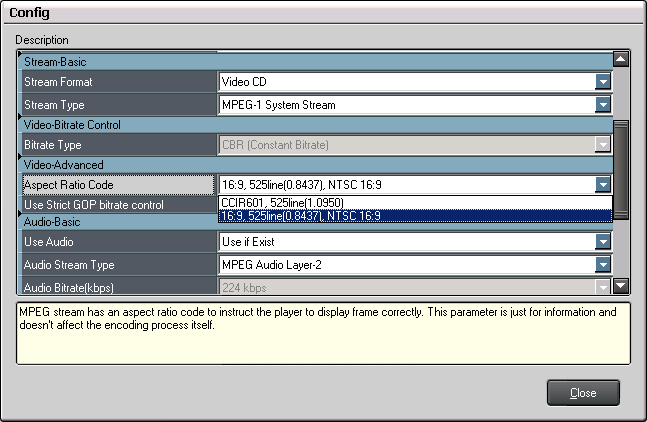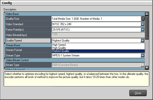 type you selected. Now select the "Video Standard" (b) of your movie (PAL/NTSC) to match the source, then select the "Quality/Speed" level (c) and then choose the "Aspect Ratio" of your movie (d) and Finaly select if to encode Audio or "Don't Use" any Audio source (e), when you are satisifed with your choices Click on "Close" to return to the "Job Summary"![]() a) ![]() b) ![]() c) ![]() d) ![]() e) ![]() |