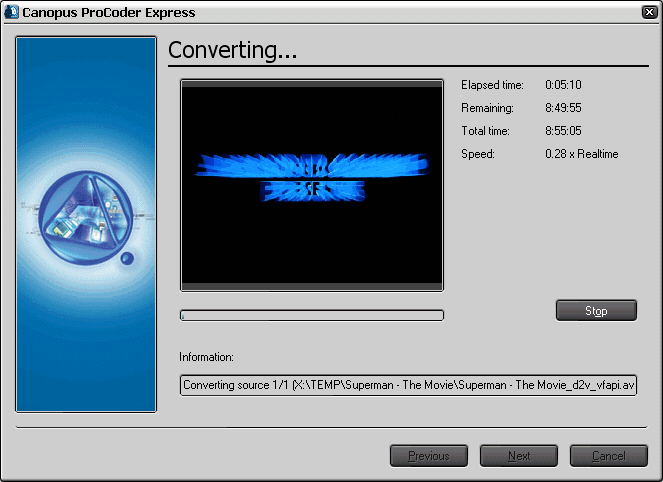 need to use Multiplexing to combine it with the Audio of the movie. NOTE: Canopus ProCoder does accept AviSynth frameserving method, so you may still be able to accomplish what I couldn't! |