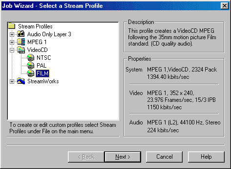 Step 2 - In the Job Wizard, select the "VideoCD" and then the type of movie you will be encoding (NTSC/PAL/FILM)