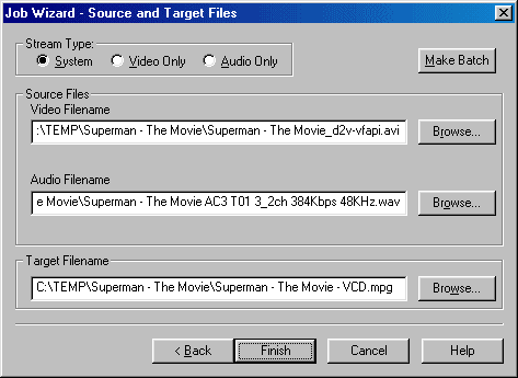 Step 3 - Now select the AVI file that the VFAPI Converter (or if you are using an AVI/DivX as source, select that instead.) created for the "Video Filename", and in the "Audio Filename" the WAV created by DVD2AVI (you can also use an MP3 file as source!), and then select the "Target Filename" and press on "Finish".