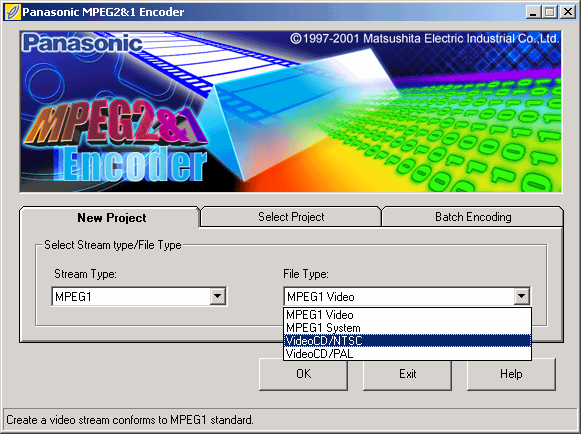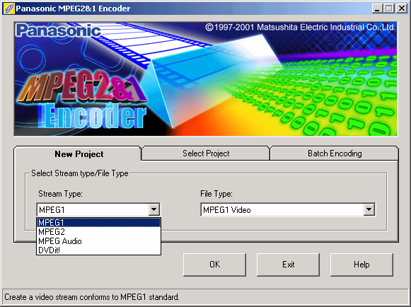 Step 1a - Open Panasonic Encoder, Under the "New Project" select the "Stream Type" you will be using, in this example it will be "MPEG1"
