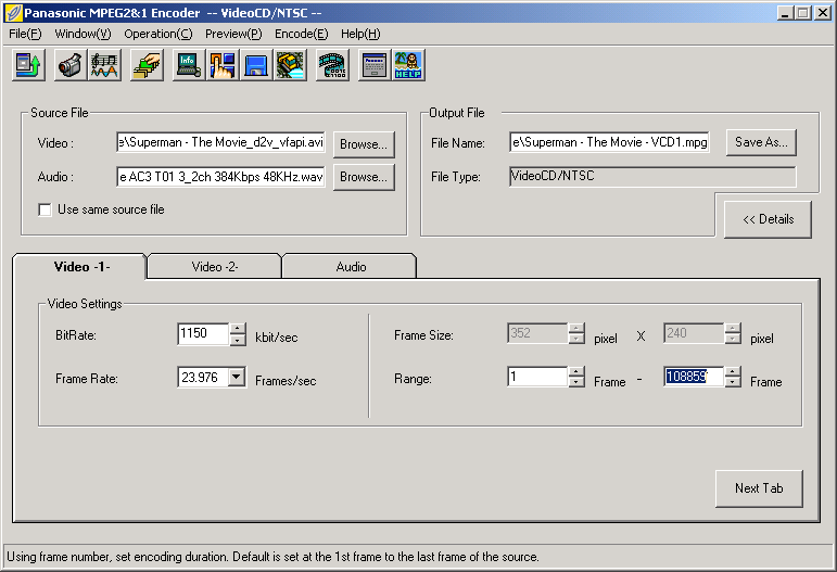 Step 2e - AFTER you finished Encoding the first part of your movie, Change the Start end End "Frame" to encode the second part.![]() |