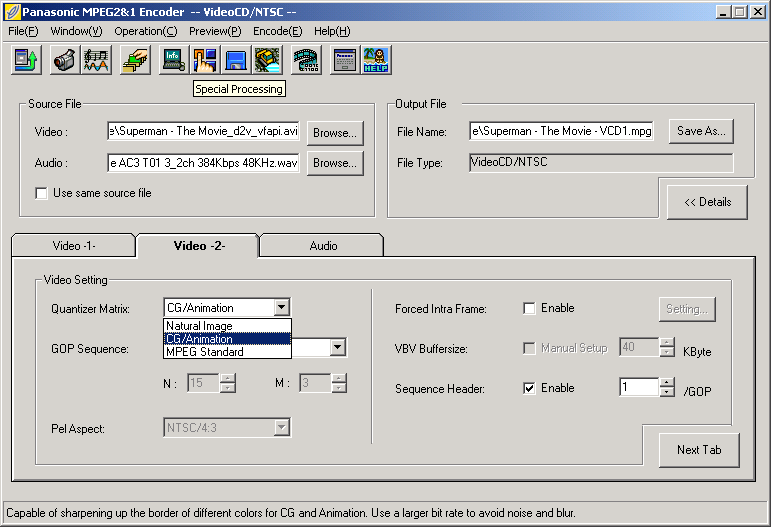 Step 2d - In the "Video -2-" category, select a "Quantizer Matrix" for the best Video Quality ![]() |