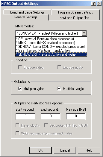 | Step 2(a/b/c/d) - Under the "General Settings" select the "MMX modes" compatible with your CPU, then go to "Input and Output files" and in the "MPEG Program Stream file" select the Output of your muxed files. In the "Open VS" select the MPEG2 Video ONLY file, In the "Open AS 1" select your First Audio Track, and if you are creating Multi-Channel movie use "Open AS 2" to select secondary audio. Under the "Program Stream Settings" set either MPEG2/SVCD or DVD Stream type. Click "OK" when done. a) b) ![]() c) d) ![]() |
