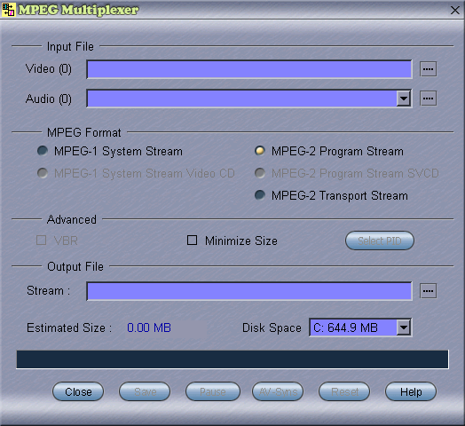 Step 2(a/b) - Under the "Input File" browse to the "Video (0)" using the "[....]" and select your Video ONLY track (MPV/M1V/M2V) and under the "Audio (0)" select your MP2 Audio file. Now select the type of "MPEG Format" you are creating.![]() ![]() |